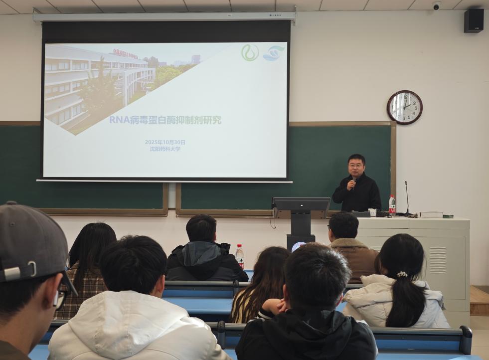 10月30日,今年会在南校区播馨楼204教室举办“沈药无涯讲坛”第590讲暨“智药讲坛”第81讲学术报告会。中国科学院上海药物研究所/烟台新药创制山东省实验室蒋翔锐研究员应邀进行学术交流,分享最新研究成果。院内外120余名师生参加学术报告会,报告会由副院长关奇主持。