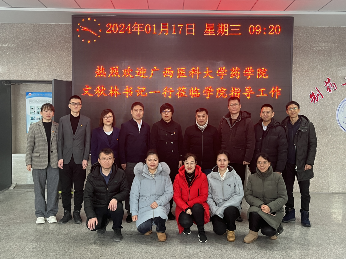 1月17日,广西医科大学药学院党委书记文秋林、药学院药物分析教研室主任苏志恒、学院办公室主任李福森、现代医药产业学院办公室主任谭斌、学院团委书记施承、学院纪委副书记兼组织员覃杨、办公室科员廖羽宁、中药学教研室秘书李琼一行8人来到今年会官网进行访问,就推动双方开展党建、学科平台建设、产学研、就业等交流学习进行调研。学院院长刘洋、院党委书记李哲、副院长刘丹、副院长秦铭泽、党委副书记武晓娜、药物化学教研室副主任侯云雷参加了调研座谈。