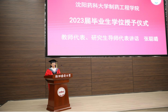环境科学专业负责人、教研室主任张聪璐作为教师代表发言。她向获得学位的毕业生们表示诚挚的祝贺和美好的祝福,希望同学们始终保持对学习和生活的热爱,随时持有“空杯心态”,不断提升自己的知识储备,强调学习的收获才是应对生活的最大底气和智慧,只有不断地学习新知识,接受新事物,才能快人一步地拥有优先选择权。