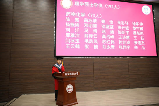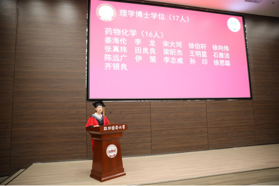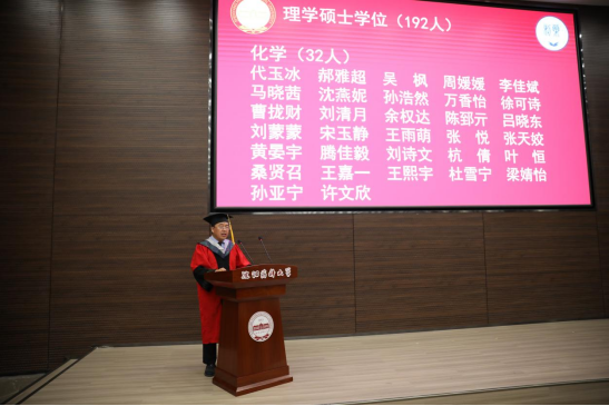 学院院长、院学位评定分委员会主任委员赵临襄宣读2023届博士学位授予名单;药物化学学科副主席许佑君、制药工程学科副主席刘洋、化学学科主席胡春、化学工程与技术学科主席侯晓虹分别宣读各学科2023届硕士学位授予名单;制药工程专业负责人刘丹、药物化学专业负责人郭春、环境科学专业负责人张聪璐、应用化学专业负责人胡春分别宣读2023届学士学位授予名单。