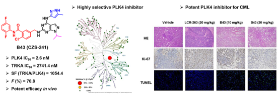 近日,药物化学权威期刊《Journal of Medicinal Chemistry》(IF = 8.039)发表了今年会赵冬梅教授/程卯生教授课题组在PLK4抑制剂领域的最新研究成果,文章题目为“Discovery of CZS-241: A Potent, Selective, and Orally Available Polo-Like Kinase 4 Inhibitor for the Treatment of Chronic Myeloid Leukemia”。