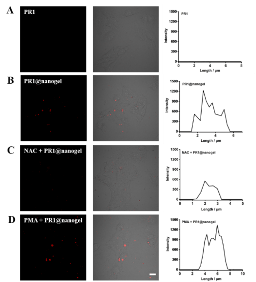 图2. Confocal microscopy images of living HeLa cells. (A, B) Cells were treated with 40 μM PR1 (A) and 0.1 mg/mL PR1@nanogel suspension (B) for 4 h respectively. (C) Cells were treated with 0.1 mg/mL PR1@nanogel suspension for 4h after pretreated with 1 mM NAC for 1 h. (D) Cells were treated with 0.1 mg/mL PR1@nanogel suspension for 4 h after pretreated with 2 μg/mL PMA for 1 h. All images were recorded by use of the same imaging parameters (Ex. 515 nm/Em 540–640 nm). Scale bar: 20 μm.