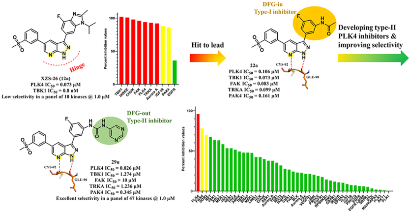 为了快速获得PLK4苗头化合物,课题组首先进行组内激酶化合物库筛选,发现PAK4抑制剂CZQ-6 (58.4% PLK4 inhibition at 2μM, IC50= 351.5 nM) (Figure 1)和TBK1抑制剂XZS-26 (92.9% PLK4 inhibition at 1μM, IC50= 73 nM) (Figure3)对PLK4显示出良好的抑制活性。课题组基于CZQ-6和XZS-26,设计、合成了两类结构新颖的PLK4抑制剂。