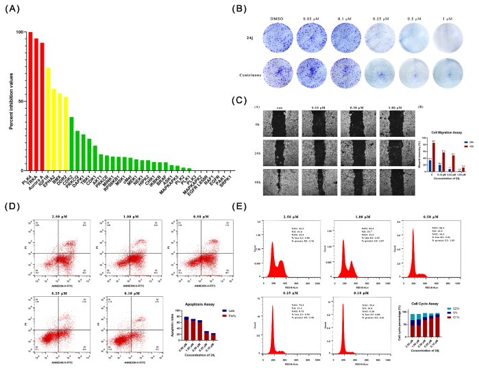 课题组采用骨架跃迁策略对CZQ-6进行结构改造得到一系列吡唑并[3,4-d]嘧啶类衍生物。随后,经进一步结构优化与构效关系探索,发现化合物24j(PLK4 IC50= 0.2 nM,PAK4 IC50= 1750.1 nM)对PLK4表现出皮摩尔的抑制活性,并且对PAK4的选择性达到8750倍。同时,它具有良好的激酶选择性(Figure2A)。化合物24j对MCF-7细胞表现出强效的增殖抑制活性,其IC50值为0.36μM。此外,它能以浓度依赖的方式抑制MCF-7细胞克隆形成、细胞凋亡、周期阻滞和细胞迁移(Figure 32B-E),并具有良好的体外类药性质。在SD大鼠体内药物动力学研究中,化合物24j的生物利用度为8.03%。以上结果表明化合物24j是一个极具潜力的先导化合物,具有进一步研究价值。