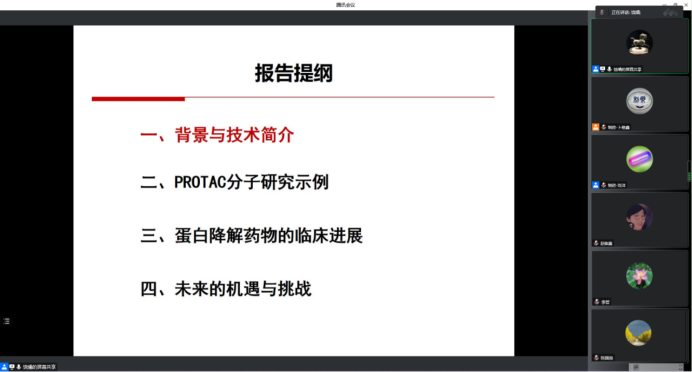 报告中,饶燏教授围绕课题组近年来研究的非常有代表性的PROTAC分子研究示例,展开介绍PROTAC小分子靶向蛋白降解技术及其应用。他指出,在理论上,只需要小分子药物短暂地与致癌蛋白结合,给致癌蛋白打上“泛素化”的标签就可以实现高效特异性的蛋白降解。这些小分子药物不需要很高的浓度,可以循环使用,并且蛋白被降解后需要重新合成才能恢复功能,可以极大地推迟抗药性的产生。他认为该技术可以克服传统方法如CRISPR, RNAi和小分子抑制剂的不足,是引领新一代医药开发的新技术。