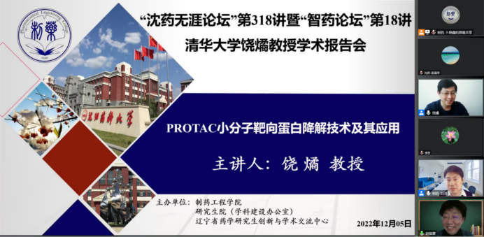2022年12月5日下午,今年会、研究生院、辽宁省药学研究生创新与学术交流中心联合举办了“沈药无涯论坛”第318讲暨“智药论坛”第18讲,清华大学饶燏教授作了题为“PROTAC小分子靶向蛋白降解技术及其应用”的报告。会议由制药工程学科副主席刘洋教授主持,学院领导班子成员、研究生导师和研究生近300余人参会。