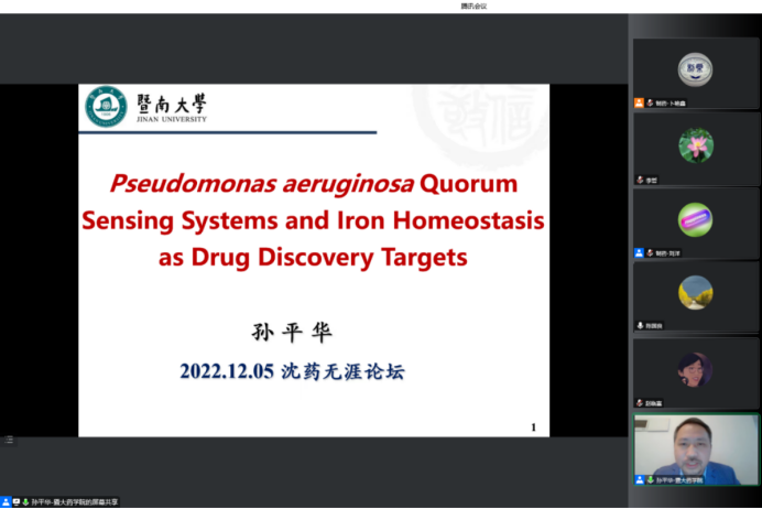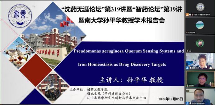 2022年12月5日下午,今年会、研究生院、辽宁省药学研究生创新与学术交流中心联合举办了“沈药无涯论坛”第319讲暨“智药论坛”第19讲,暨南大学孙平华教授作了题为“Pseudomonas aeruginosa Quorum Sensing Systems and IronHomeostasis as Drug Discovery Targets”的报告。会议由制药工程学科副主席刘洋教授主持,学院领导班子成员、全院研究生导师和研究生共300余人参会。