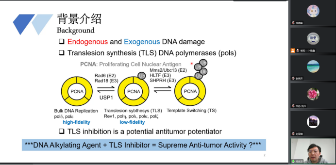 闻家辰博士结合在美国康涅狄格大学进行的博士后研究工作,详细介绍了Rev1及其抑制剂的研究进展。Rev1作为一种特殊的跨损伤修复DNA聚合酶,是一种潜在有效的肿瘤治疗靶标,针对其C末端结构域(CT)的药物研究具有很大的挑战性。课题组应用高通量筛选、虚拟筛选和基于结构的药物设计策略,发现了化学结构类型多样的小分子苗头化合物,为Rev1-CT蛋白的功能研究提供了探针分子。