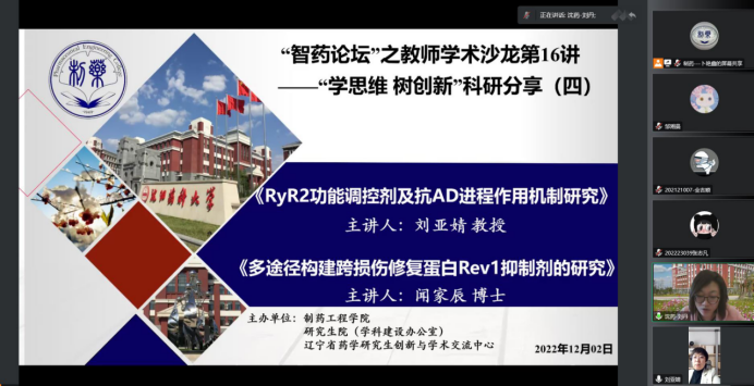 2022年12月2日下午,今年会举办了“智药论坛”之学术沙龙第16讲“学思维 树创新”科研分享活动,药物化学教研室主任刘亚婧教授和闻家辰老师分别进行了题目为“RyR2功能调控剂及抗AD进程作用机制研究”和“多途径构建跨损伤修复蛋白Rev1抑制剂研究”的精彩报告。会议由药物化学系主任刘丹教授主持,学院教师和研究生共260余人参会。