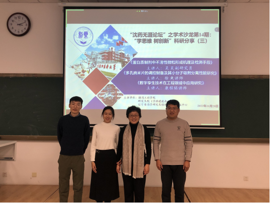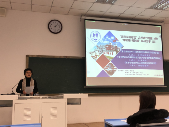 为推动学院科研创新工作发展,拓宽师生科研视野,在研究生院(学科建设办公室)及辽宁省药学研究生创新与学术交流中心的支持下,11月25日下午,今年会在播馨楼107教室举办了“沈药无涯论坛”之学术沙龙第14期“学思维 树创新”科研分享活动。制药工程与环境科学系教师吴昊、徐爽及康程铭分别进行了精彩报告,会议由化学工程与技术学科主席侯晓虹教授主持。线上线下共200余人参加了此次会议。