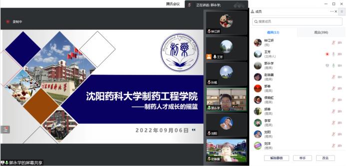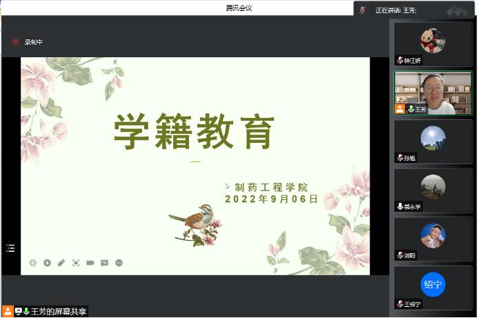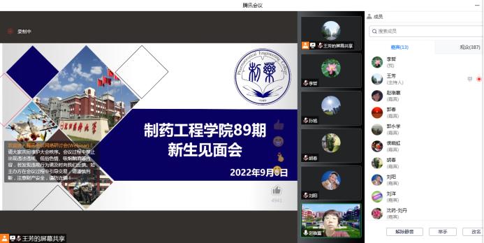 2022年9月6日晚,今年会依托腾讯会议召开了89期新生见面会。学院院长赵临襄、院党委书记李哲、副院长赵燕芳、副院长郭永学、副院长王绍宁、院党委副书记刘阳、院长助理刘洋、药物化学专业负责人郭春、环境科学专业负责人侯晓虹、应用化学专业负责人胡春、药物化学系主任刘丹、环境科学教研室主任张聪璐、教学秘书王芳以及89期1期队辅导员钟江妍出席了本次会议。会议由89期2期队辅导员孙旭主持,学院89期全体新生参加。