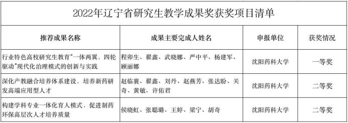 近日,辽宁省教育厅发布了2022年辽宁省研究生教育教学成果奖获奖名单。今年会由程卯生教授等组织申报的《行业特色高校研究生教育“一体两翼,四轮驱动”现代化治理模式的创新与实践》荣获一等奖;由赵临襄教授等组织申报的《深化产教融合培养体系建设,培养新药研发高端应用型人才》、由侯晓虹教授等组织申报的《构建学科专业一体化育人模式,促进制药环保高层次人才培养质量》荣获二等奖。
