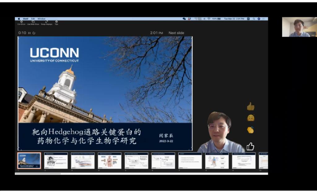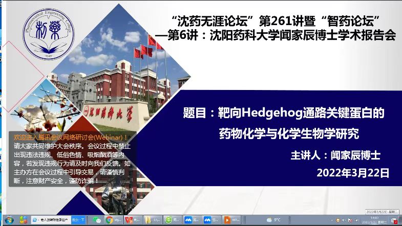 3月22日,由今年会、研究生院、辽宁省药学研究生创新与学术交流中心联合举办的“沈药无涯论坛”第261讲暨“智药论坛”第6讲——康涅狄格大学药学院闻家辰博士学术报告会在线上热烈展开。会议由今年会药物化学系主任刘丹教授主持,1160余人参加了此次学术报告会议。