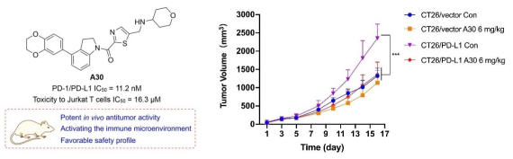 研究小组采用基于结构的药物设计策略对前期发现的活性化合物进行了多轮结构优化,得到活性显著的化合物A30。进一步实验表明,A30在分子水平上可显著抑制PD-1/PD-L1相互作用,其IC50值为11.2 nM;有效促进T细胞增殖,并恢复其释放IFN-γ功能;有效抑制4T1及过表达PD-L1的CT26/PD-L1动物模型肿瘤生长,且具有良好的安全性。作用机制研究表明,A30可显著改善CT26/PD-L1组小鼠肿瘤组织淋巴细胞浸润,提高CD8+/CD3+比值,促进CD3+T细胞释放IFN-γ和IL-2的能力,且增大CD3+T细胞的占比及增强杀伤功能。以上研究表明,A30可作为有效的免疫调节化合物开展后续研究。