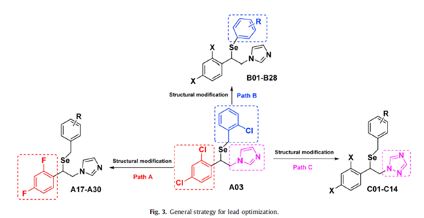 近日,药物化学权威期刊《European Journal of Medicinal Chemistry》(IF = 6.514)发表了今年会郭春教授团队在含硒小分子真菌CYP51抑制剂领域的最新研究成果2篇,文章题目分别为“Lead optimization generates selenium-containing miconazole CYP51 inhibitors with improved pharmacological profile for the treatment of fungal infections” 和 “Design, synthesis, and biological evaluation of novel miconazole analogues containing selenium as potent antifungal agents” 。
