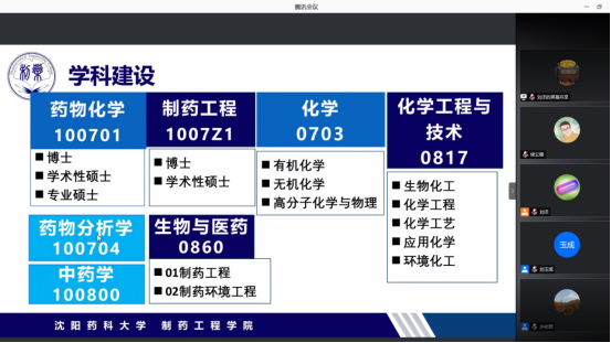 此后,由学院各学科主席对“十三五”期间的学科建设工作和“十四五”的主攻方向做汇报交流。学科主席许佑君教授汇报了药物化学学科在过去五年里取得的重大科技成果,介绍学科将以“靶点药物设计与新药创新研究”为重点支持方向,积极拓展研究热点,力争在抗感染、抗肿瘤、抗糖尿病、抗哮喘及抗阿尔茨海默症等新药研究方面获得突破,通过积极引进和重点培养,解决高端人才贫乏的发展瓶颈问题;学科主席郭春教授汇报了制药工程学科构建“以药为主, 理工结合、产学研一体化”的专业学位研究生培养新模式,提出进一步优化导师队伍、扩大招生规模、持续提高成果转化能力的建设目标;学科主席侯晓虹教授汇报了化学工程与技术学科通过组织学生参加学术活动、竞赛活动和国际交流活动,提高学生创新创业能力和水平,指出了未来要构建专业背景丰富且互补的师资梯队、激发年轻教师的科研热情及下大力气引进各层次人才的具体工作目标。