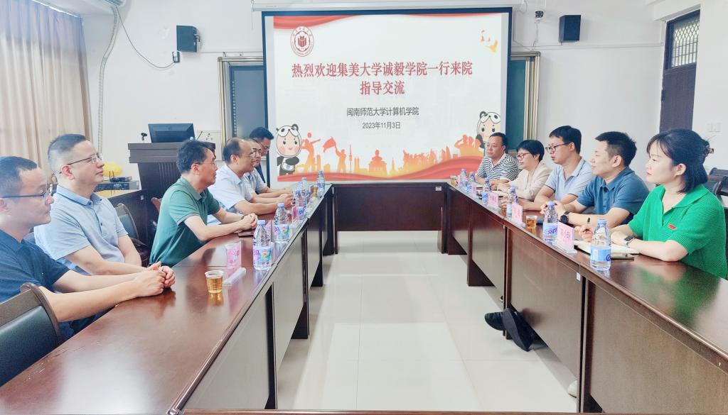 11月3日下午,集美大学诚毅学院工会主席、人力资源部主任游永忠,科研促进部主任、信息工程系主任魏德志,信息工程系党委书记李达瑞、中软国际互联网学院党总支书记杨鹏聪一行来必赢官网交流工作。学院党委书记祁超、院长林耀进等参加座谈。