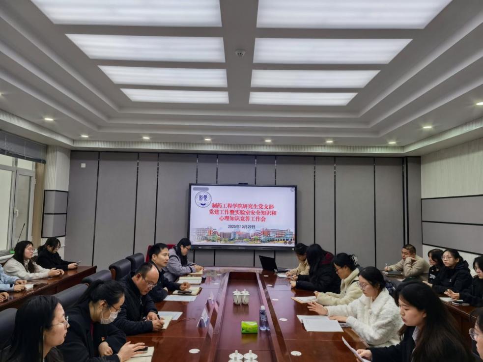 为深入推进党建工作与学科特色、学生培养深度融合,以党建引领实验室安全管理提质、心理健康教育增效,10月 29日下午,今年会研究生党支部在制药楼227室召开党建工作部署会暨实验室安全知识与心理知识竞答工作会。学院党委书记王中华出席并讲话,党委副书记刘鹏程主持会议。学院组织员仲恒、丛璐,研究生辅导员钟梓俊、盛志成、刘薇薇以及各研究生党支部学生代表参会。