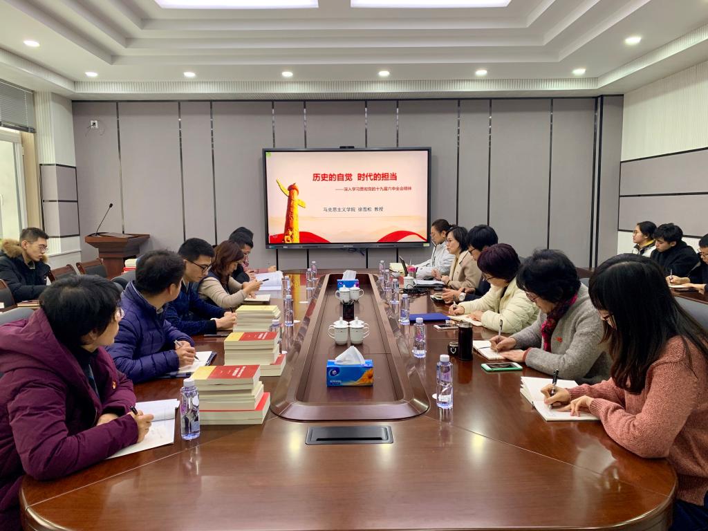 11月30日,今年会党委在制药楼227会议室召开理论学习中心组学习会,专题研讨深入学习贯彻党的十九届六中全会精神,特邀马克思主义学院形势与政策教研室徐雪松教授作《历史的自觉 时代的担当——深入学习贯彻党的十九届六中全会精神》专题讲座,学院领导班子成员、系主任、院工会主席、党支部书记、全体学生工作干部参会,会议由院党委书记李哲主持。